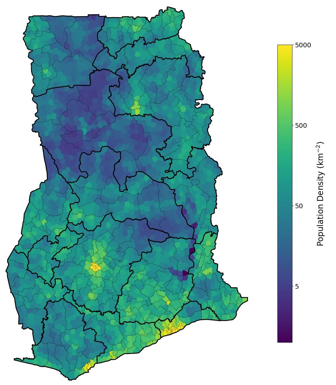 WorldPop estimates of the spatial distribution of the population were aggregated from constrained 1km approximations to the 10km scale, with individual nodes respecting district boundaries (second administrative level). Districts smaller than 100km2 were not subdivided.