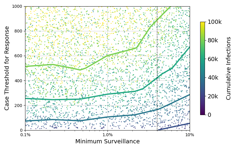 Increasing the surveillance rate in districts with below average reporting reduced the expected number of cumulative infections over the period Jan 2022 - Dec 2024. This effect was present at all response thresholds but was most notable for higher thresholds when outbreak response was less common.