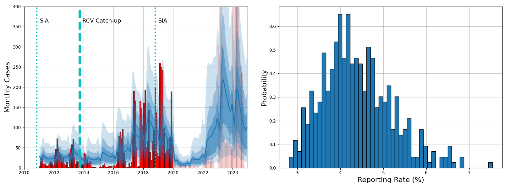 Test scenarios implemented hypothetical regional outbreak response SIAs starting in 2022. These responses were triggered based on varying thresholds of observed cases. Spatially heterogeneous reporting rates were assumed with a mean reporting rate of 4%