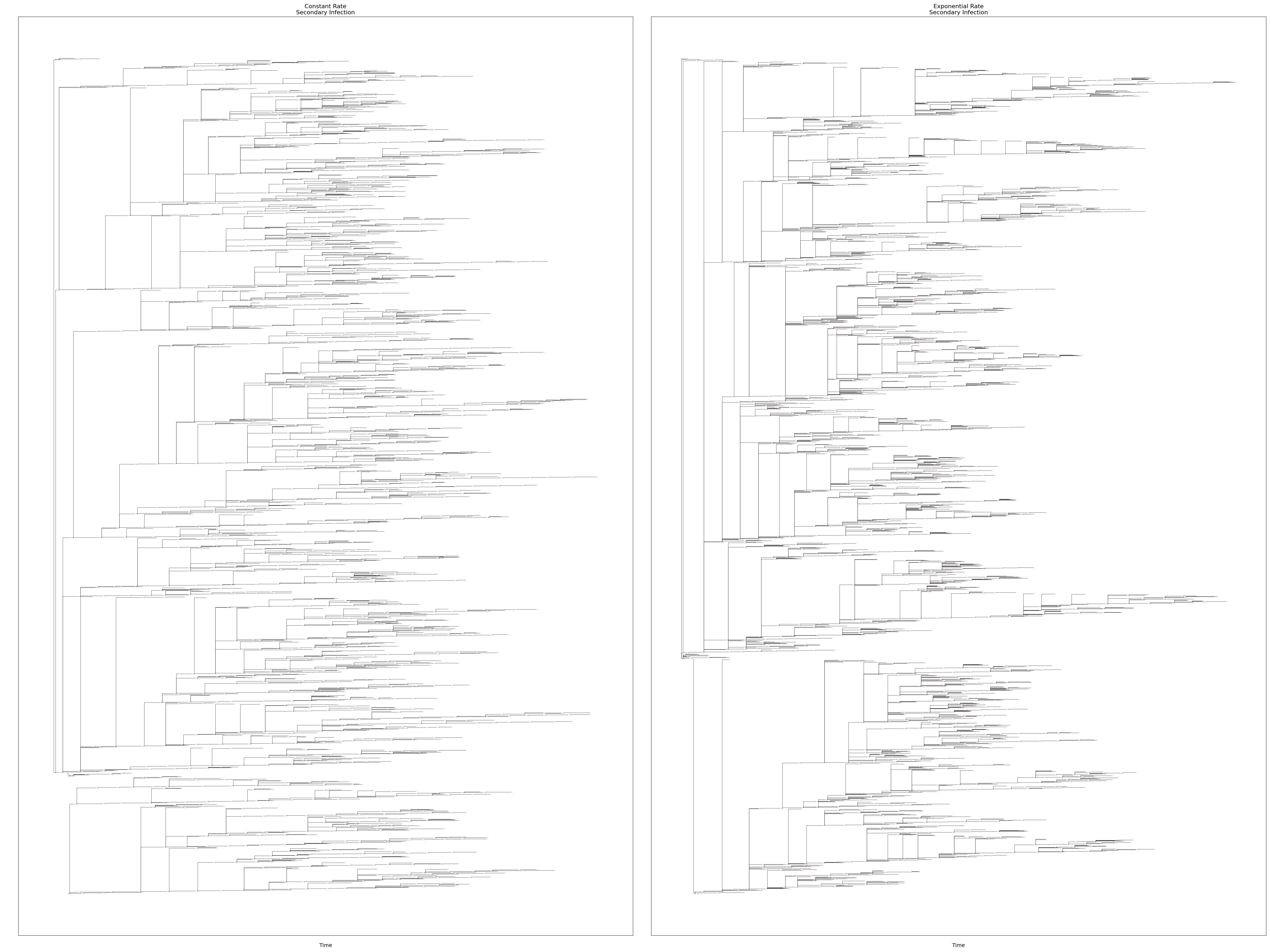 This example demonstrates the implementation of superspreading behavior and its visualization using transmission trees. These simulations use a constant R0 value of 1.5 and one of two variance levels for the secondary transmission rate: constant or exponential. A constant rate has each infected individual cause secondary infections via a Poisson process with rate equal to R0; an exponential rate has each infected individual cause secondary infections via a Poisson process where the rate is drawn from an exponential distribution with mean equal to R0.