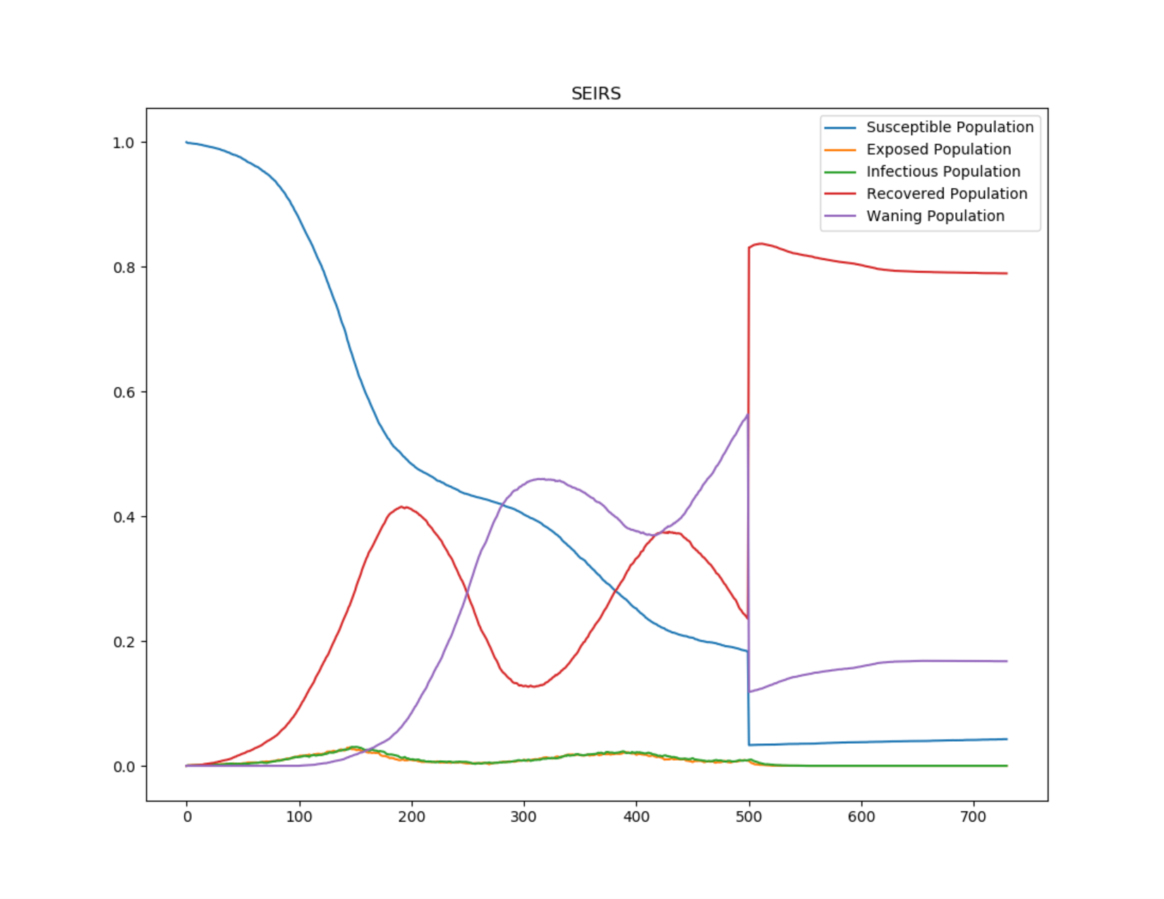 You can also add vital dynamics to an SEIRS model, where \(\mu\) and \(\nu\) again represent the birth and death rates, respectively. To maintain a constant population, assume that \(\mu = \nu\). In steady state \(\frac{dI}{dt} = 0\). The ODE then becomes: