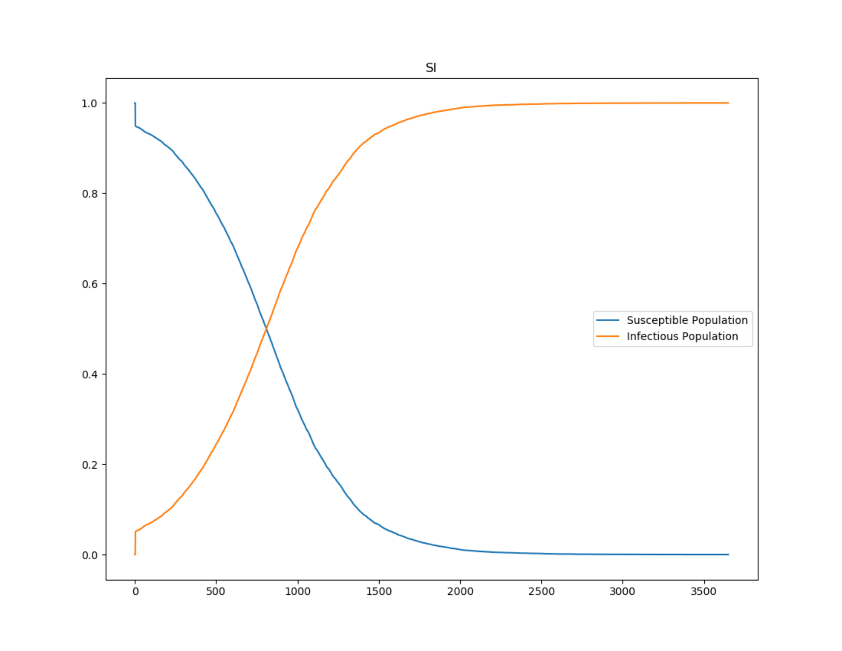 Figure 3: SI outbreak approaching 85% infected population at steady state#